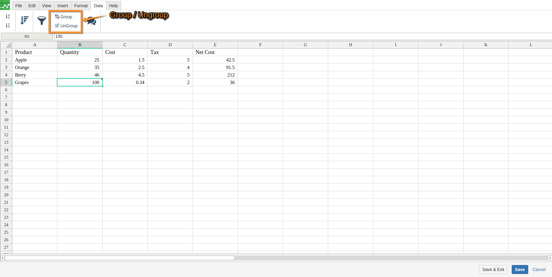 Highlight any rows and/or columns you would like to group together, then press the group button.