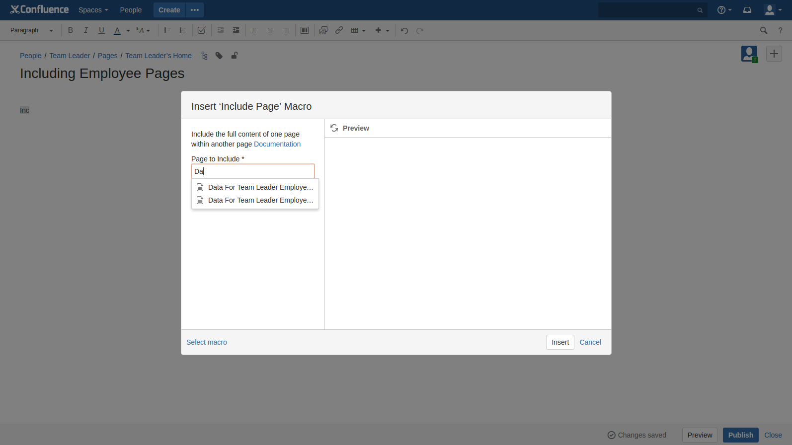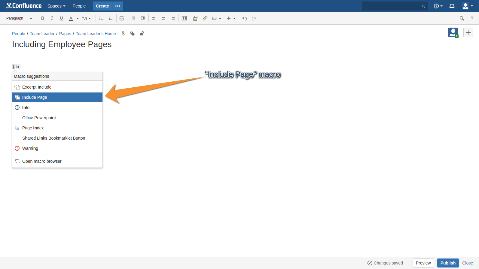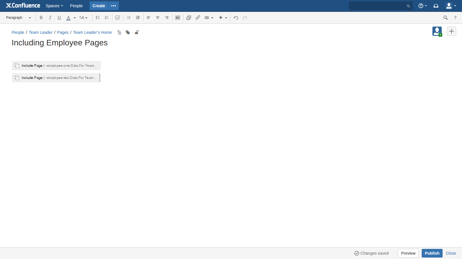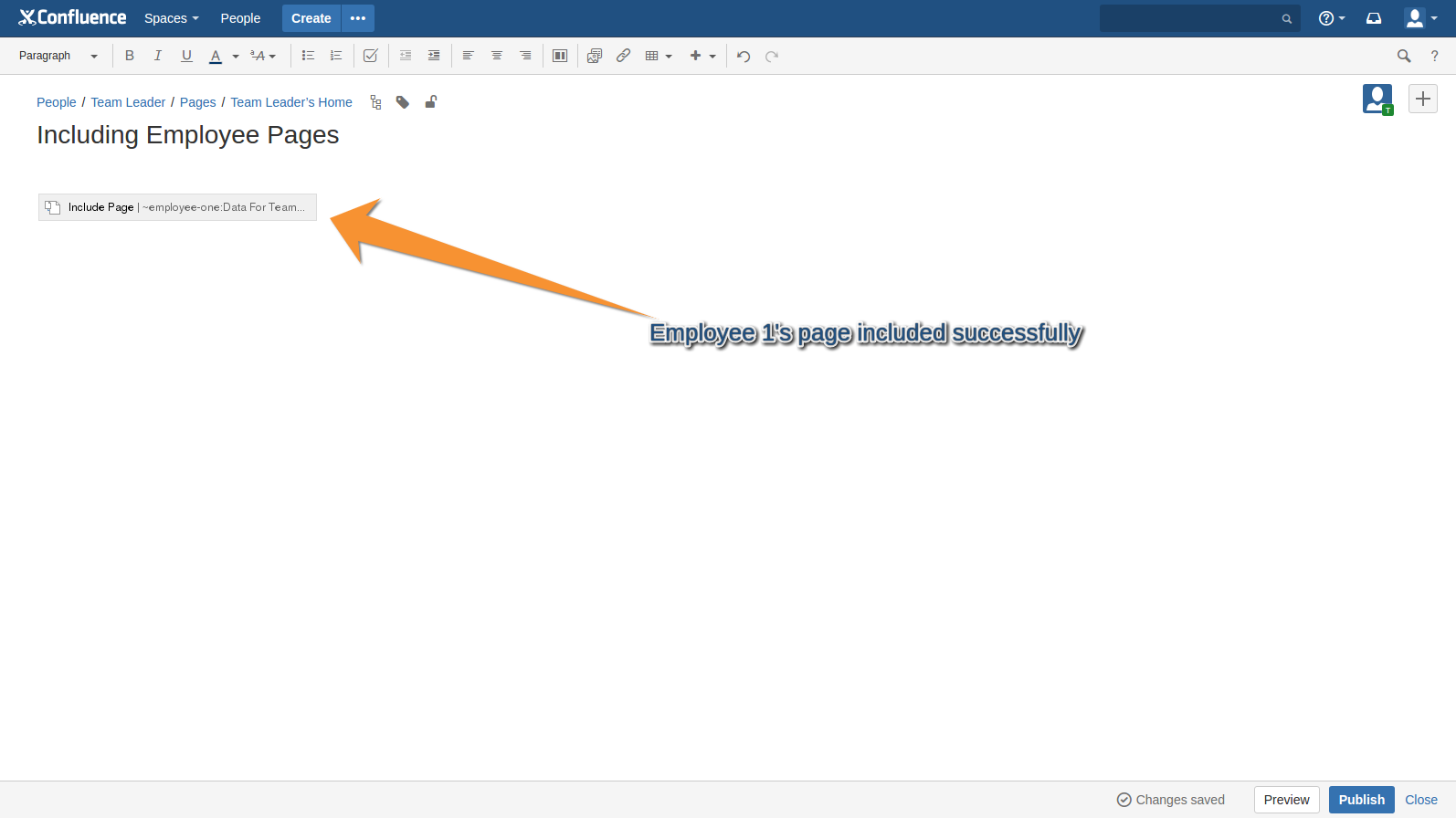 - Start by including Employee 2's page with the "Page Include macro". Please note that Employee 1 should have view permissions on the Employee 2's page.