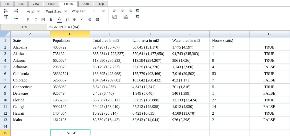 value- The text to be checked.ISNONTEXTreturnsFALSEif this is a text value or a reference to a cell containing a text value andTRUEotherwise.When