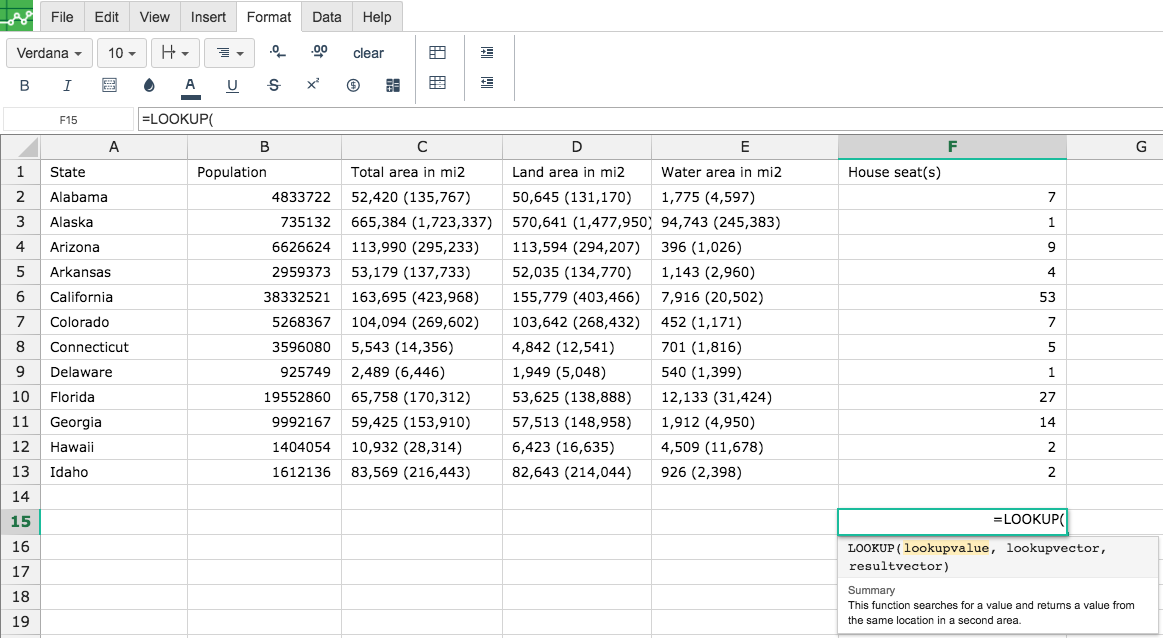 search_key- The value to search for in the row or column. For example, 42, "Cats", or I24.search_range|search_result_array- One method of usingLOOKUPis to provide a single row or columnsearch_rangeto look through for the search with a second argumentresult_range. The other way is to combine these two arguments into onesearch_result_arraywhere the first row or column is searched and a value is returned from the last row or column in the array.result_range- [ OPTIONAL ] - The range from which to return a result. The value returned corresponds to the location wheresearch_keyis found insearch_range. This range must be only a single row or column and should not be used if using thesearch_result_arraymethod.