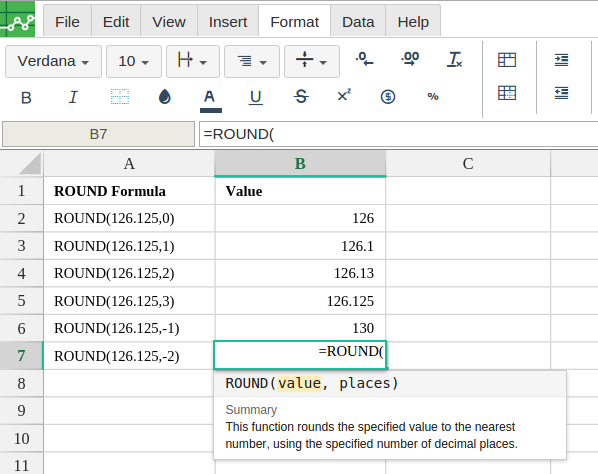 value- The value to round toplacesnumber of places.places- [ OPTIONAL -0by default ] - The number of decimal places to which to round.placesmay be negative, in which casevalueis rounded at the specified number of digits to the left of the decimal point.