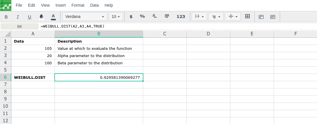 Then type in the WEIBULL.DIST formula in the area you would like to display the outcome: