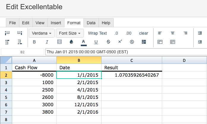 cashflow_dates- An array or range with dates corresponding to the cash flows incashflow_amounts.rate_guess- [ OPTIONAL - 0.1 by default ] - An estimate for what the internal rate of return will be.
